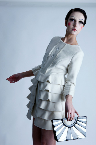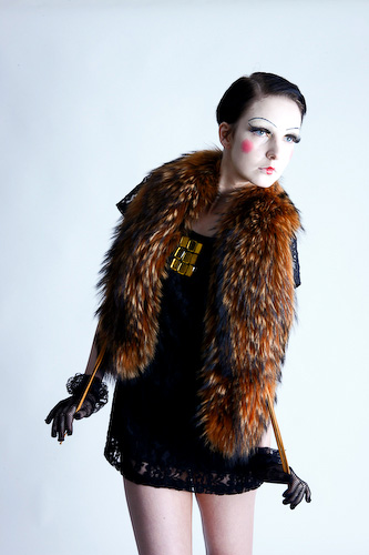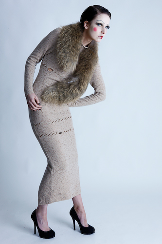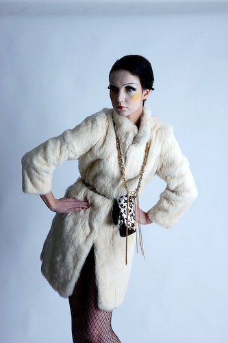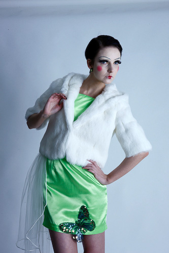 (33) White Rabbit Fur Jacket and Apple Green silk detail Cocktail Dress