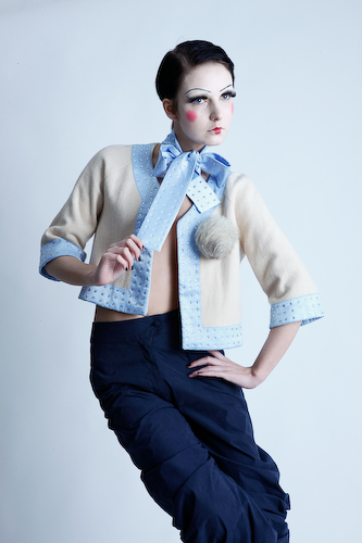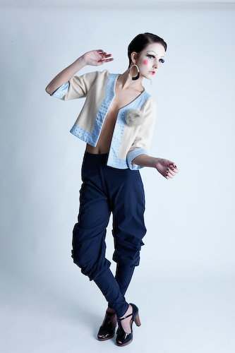 (30) Gem Silk collar Cashmere Top and Navy Harem Pants